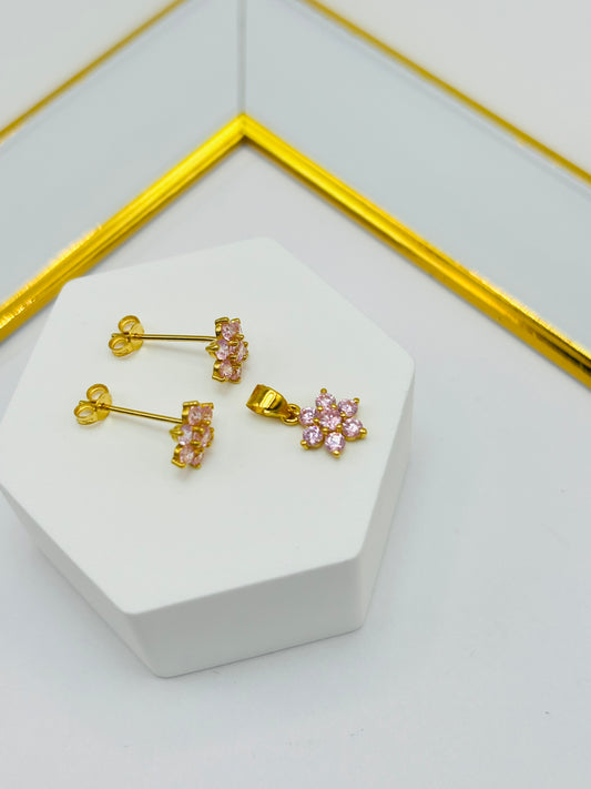 18K Gold Flower Stone Earrings and Pendant Set (Pink)