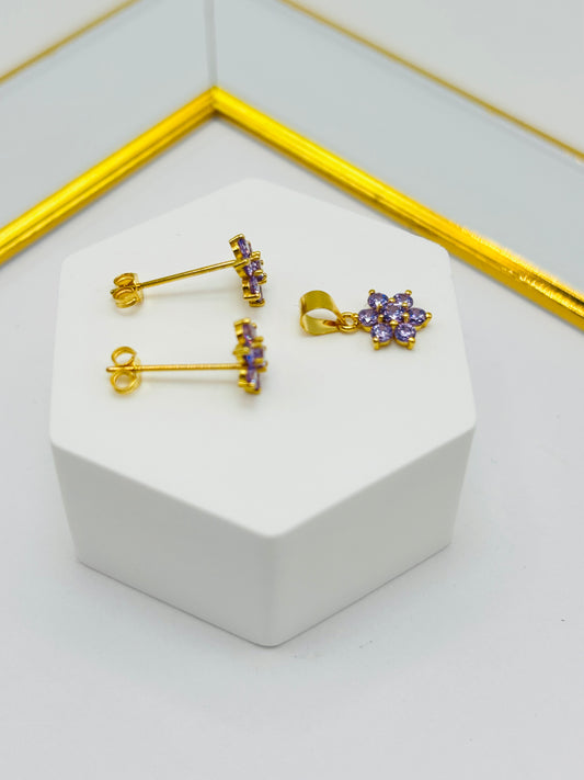 18K Gold Flower Stone Earrings and Pendant Set (Purple)