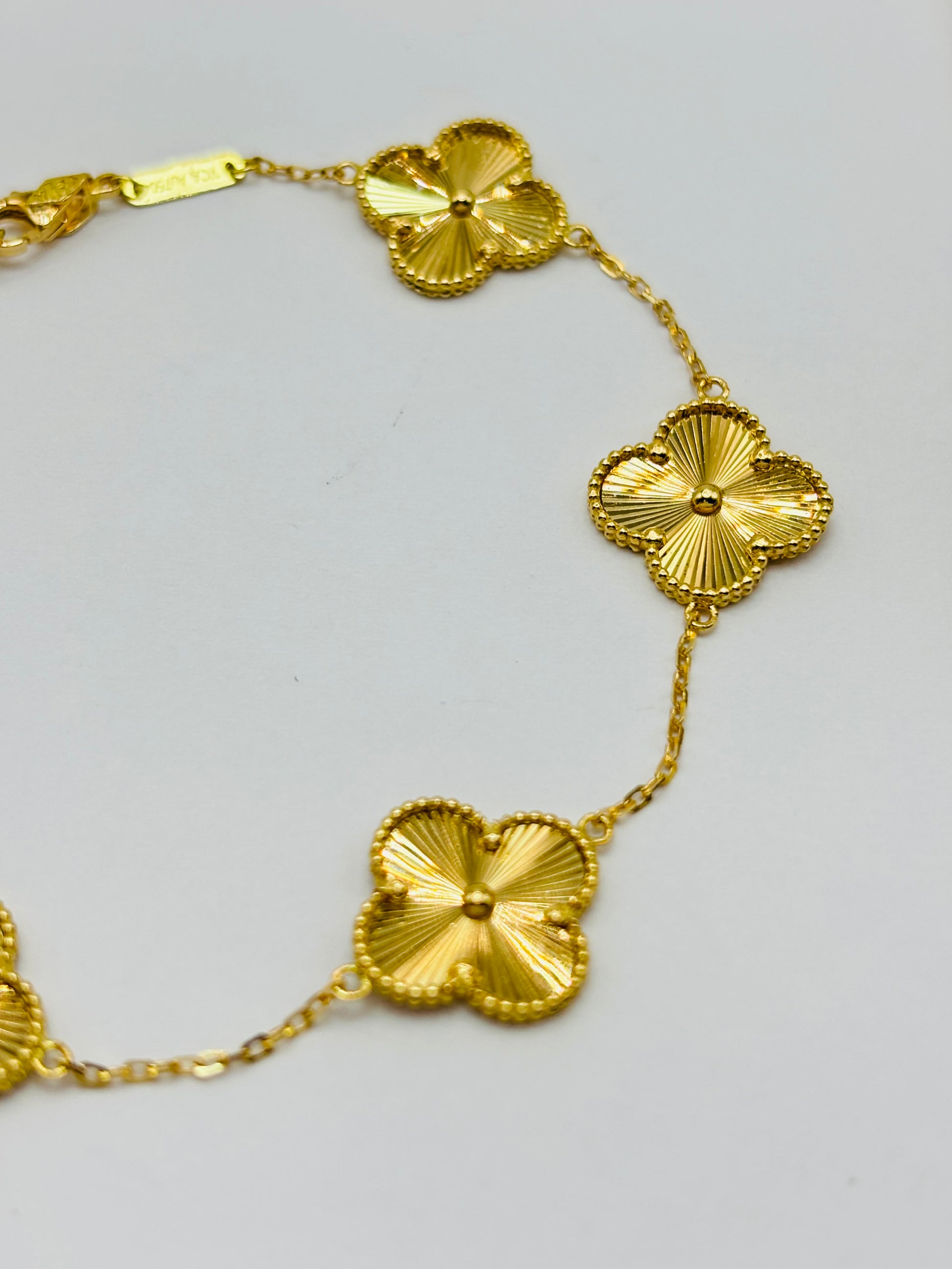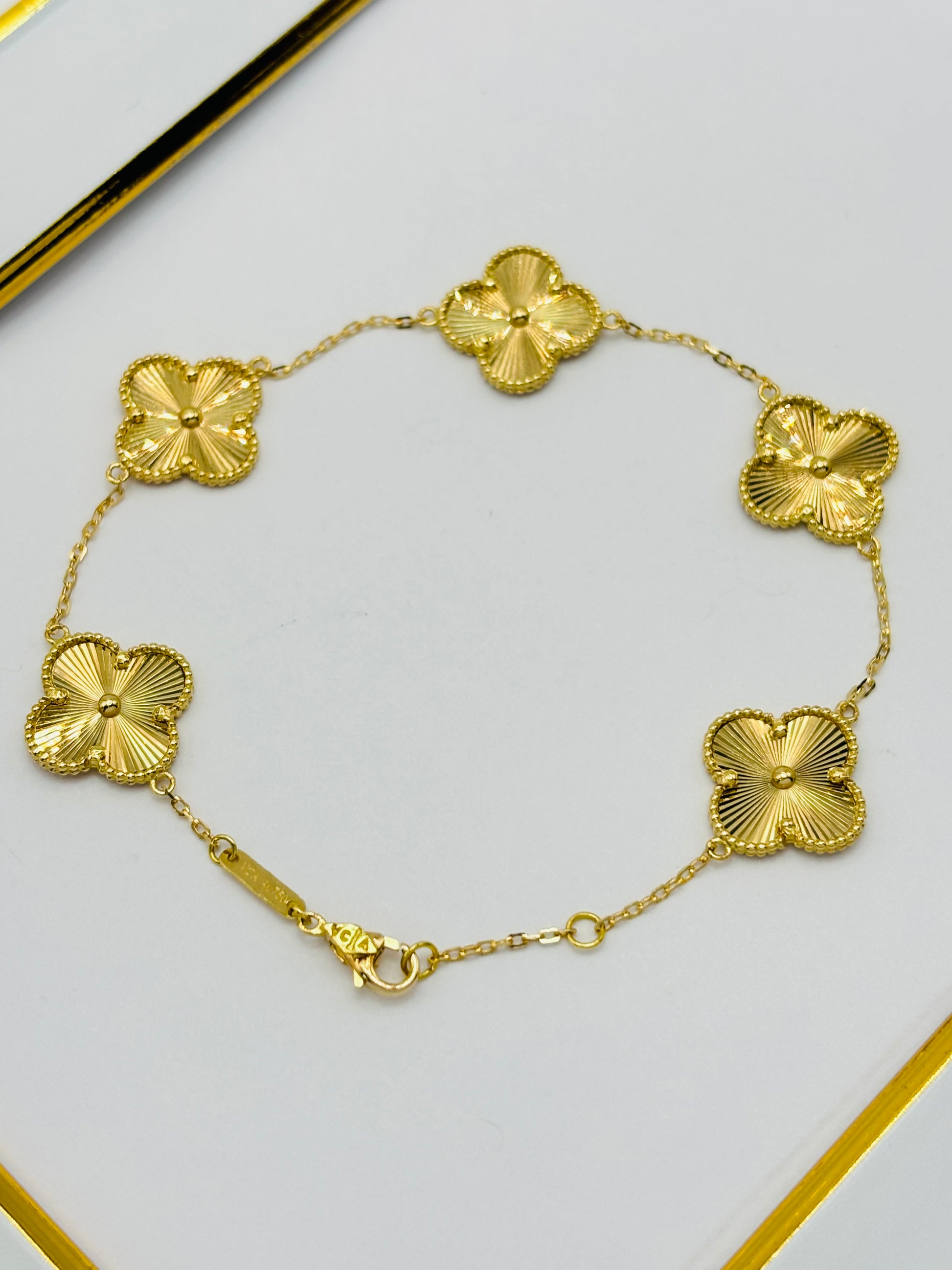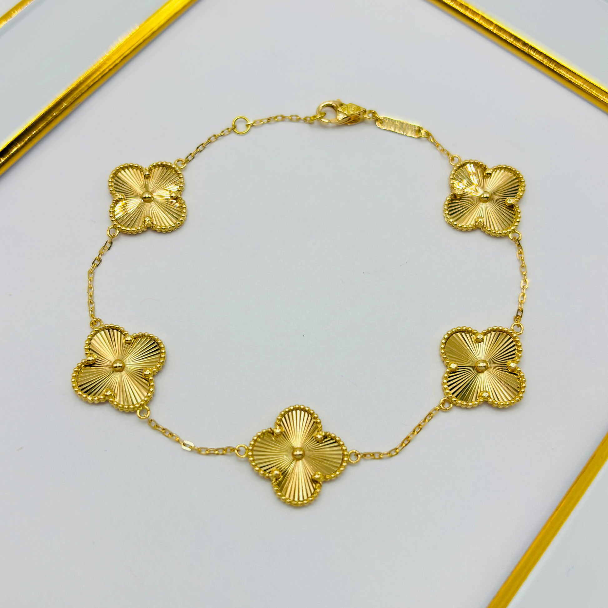 Elevate your style with this exquisite 18K Gold 5 Clover Bracelet, weighing 6.18 grams. Crafted with precision, its unique five-clover design symbolizes luck and elegance, making it the perfect accessory for any occasion. This bracelet adds a touch of timeless luxury to your look while offering lasting shine. A meaningful piece that blends sophistication with a hint of charm.