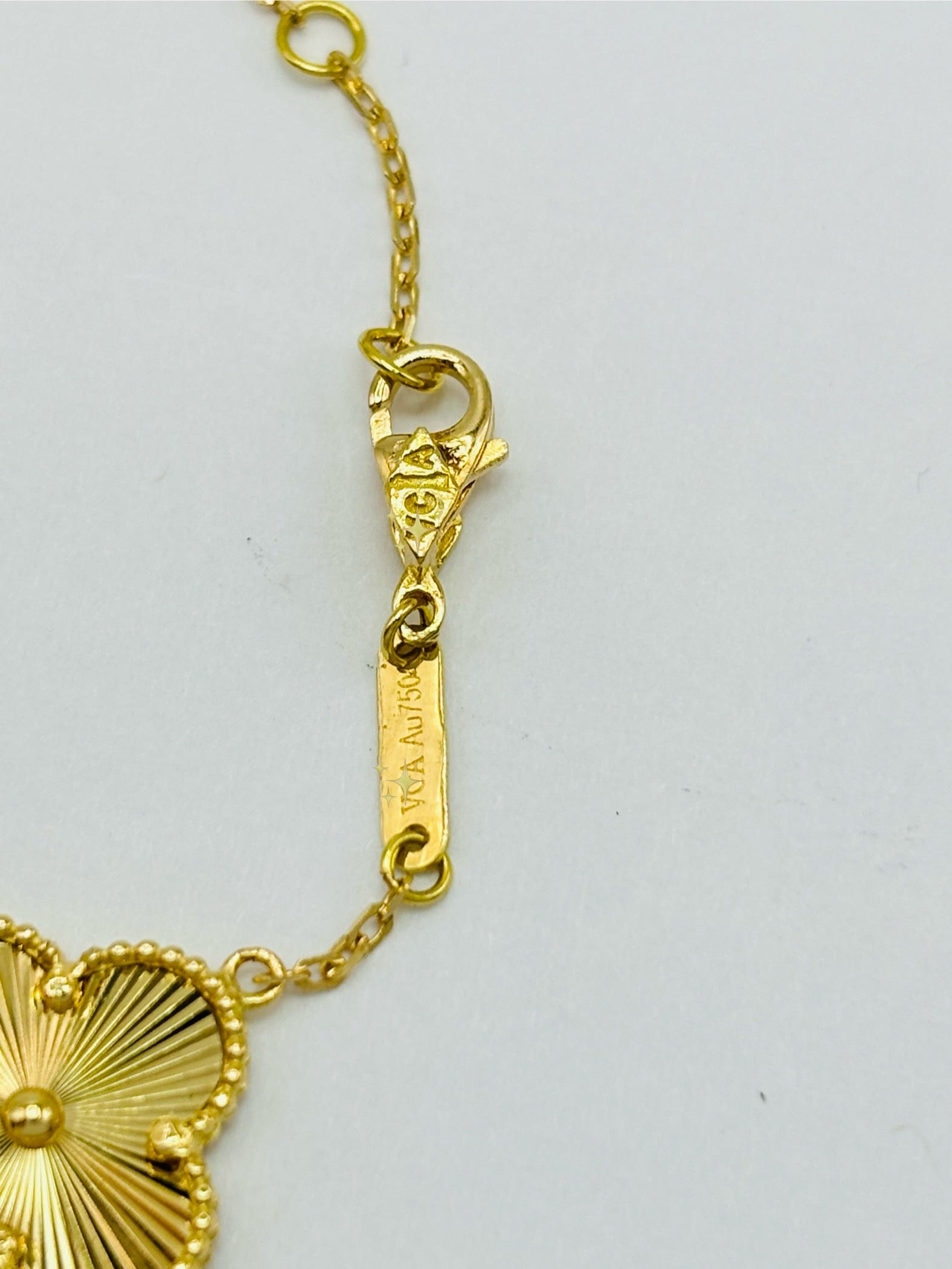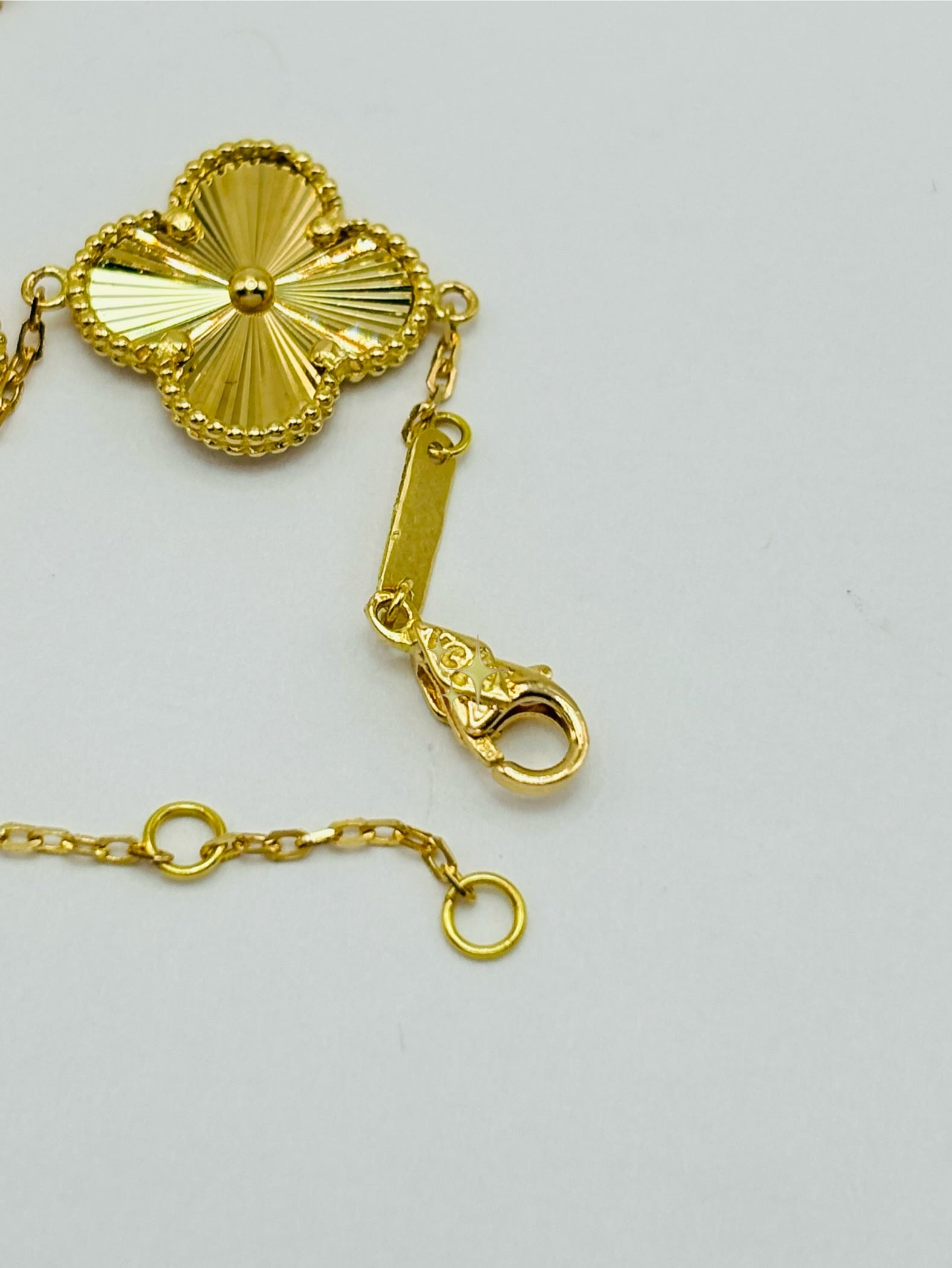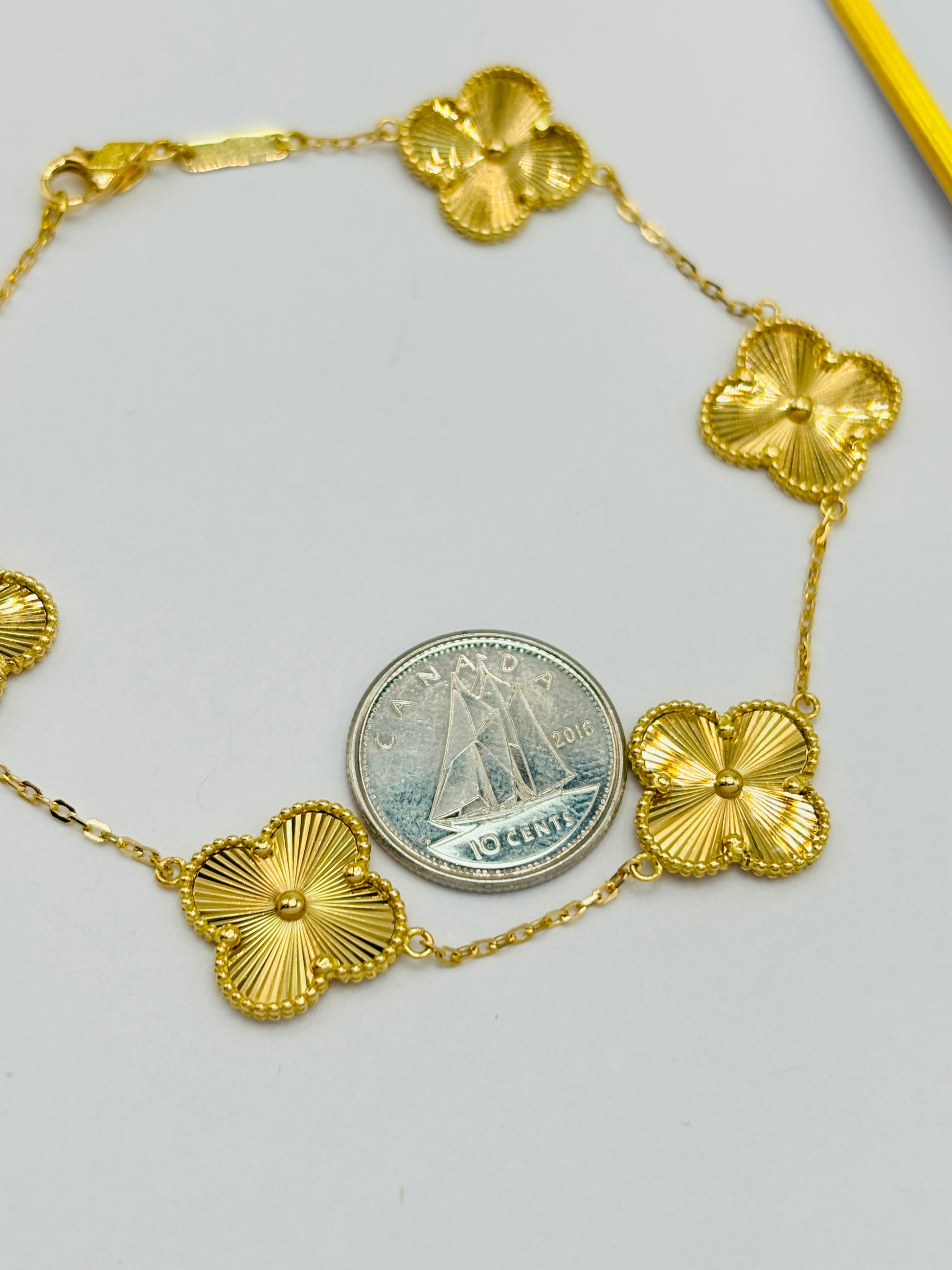 Elevate your style with this exquisite 18K Gold 5 Clover Bracelet, weighing 6.18 grams. Crafted with precision, its unique five-clover design symbolizes luck and elegance, making it the perfect accessory for any occasion. This bracelet adds a touch of timeless luxury to your look while offering lasting shine. A meaningful piece that blends sophistication with a hint of charm.