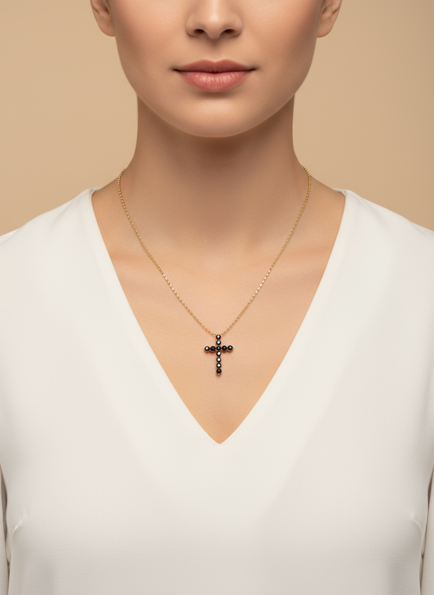 Elevate your style with this 18K Gold Black Natural Diamond Cross Necklace, where timeless elegance meets bold sophistication. Crafted from lustrous 18K gold, the pendant features genuine black diamonds that add a captivating depth and unique sparkle. Perfect for making a statement or as a cherished gift, this necklace combines spiritual symbolism with refined luxury, ensuring it complements any outfit effortlessly. Wear a piece that reflects your individuality and grace.