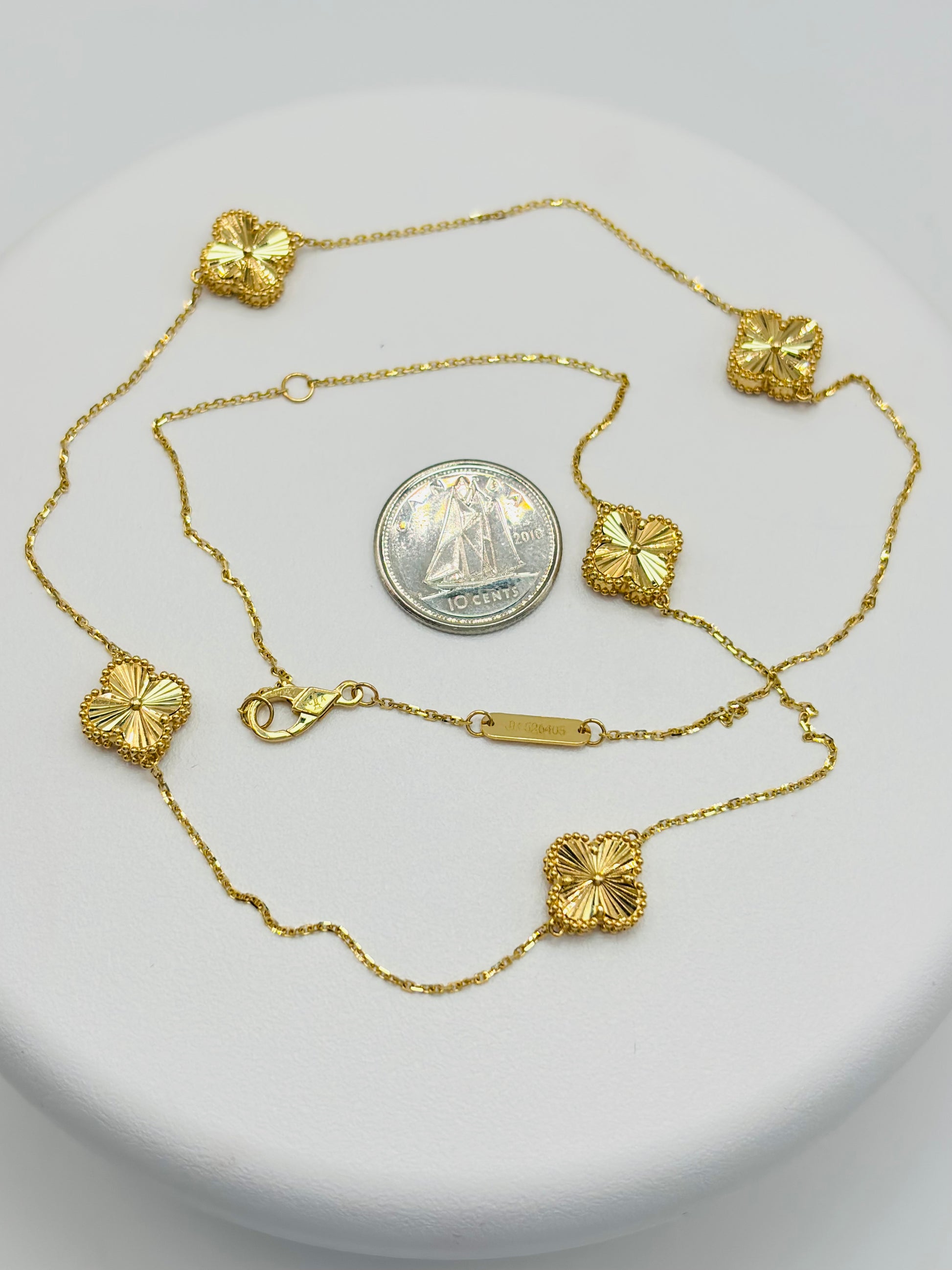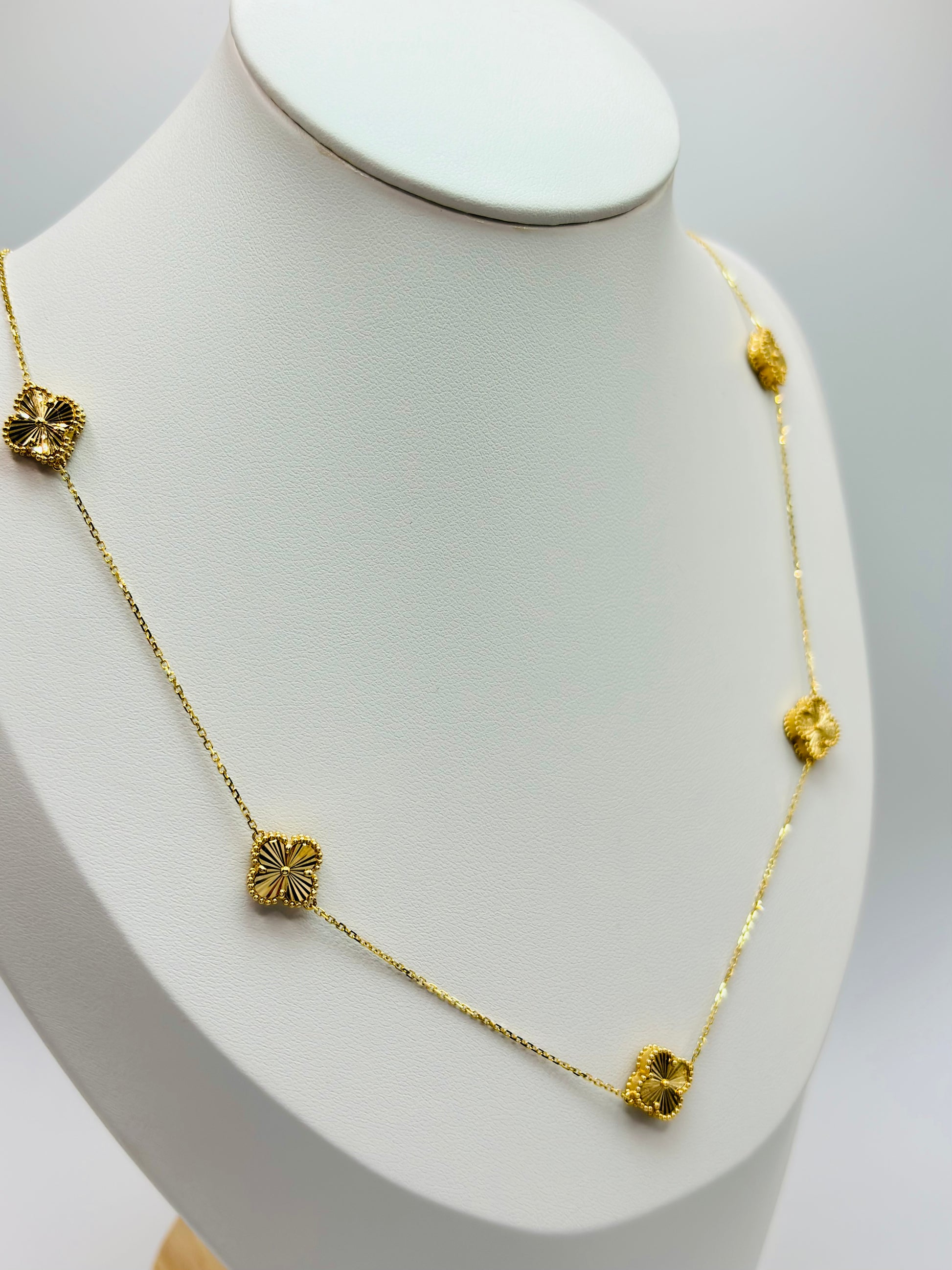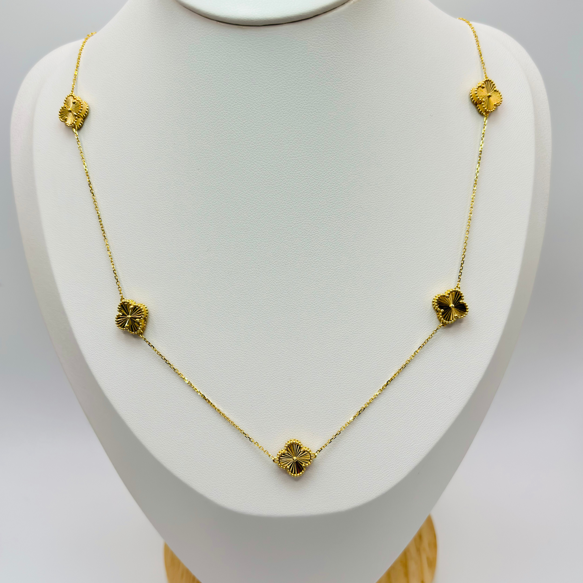 This 18K Gold Clover Necklace combines timeless elegance with meaningful design. Weighing 7.1 grams, it delivers a luxurious feel, perfect for special occasions. The delicate clover symbolizes good luck and positivity, making it an ideal gift or personal treasure that enhances any style with a subtle, radiant shine.