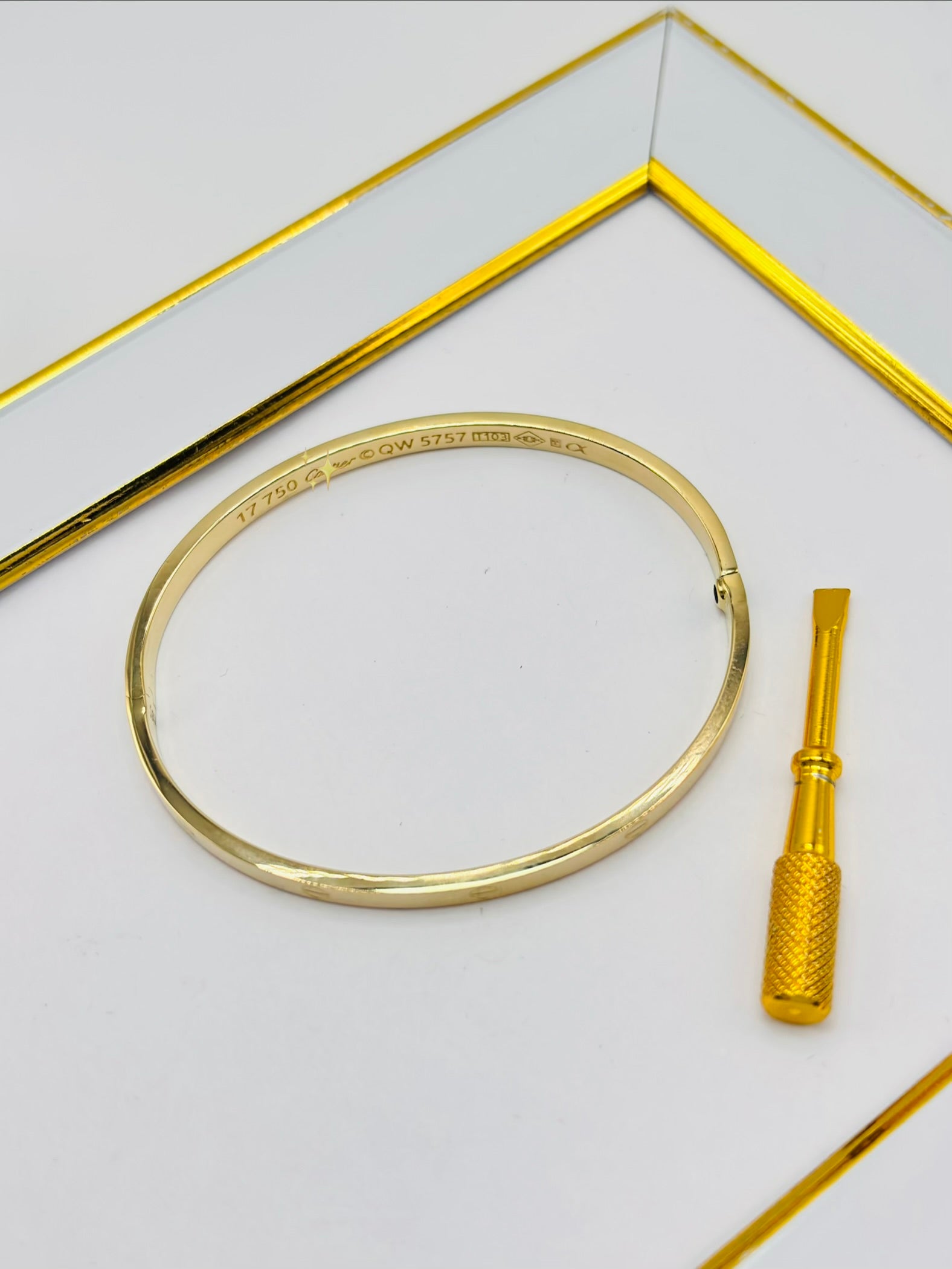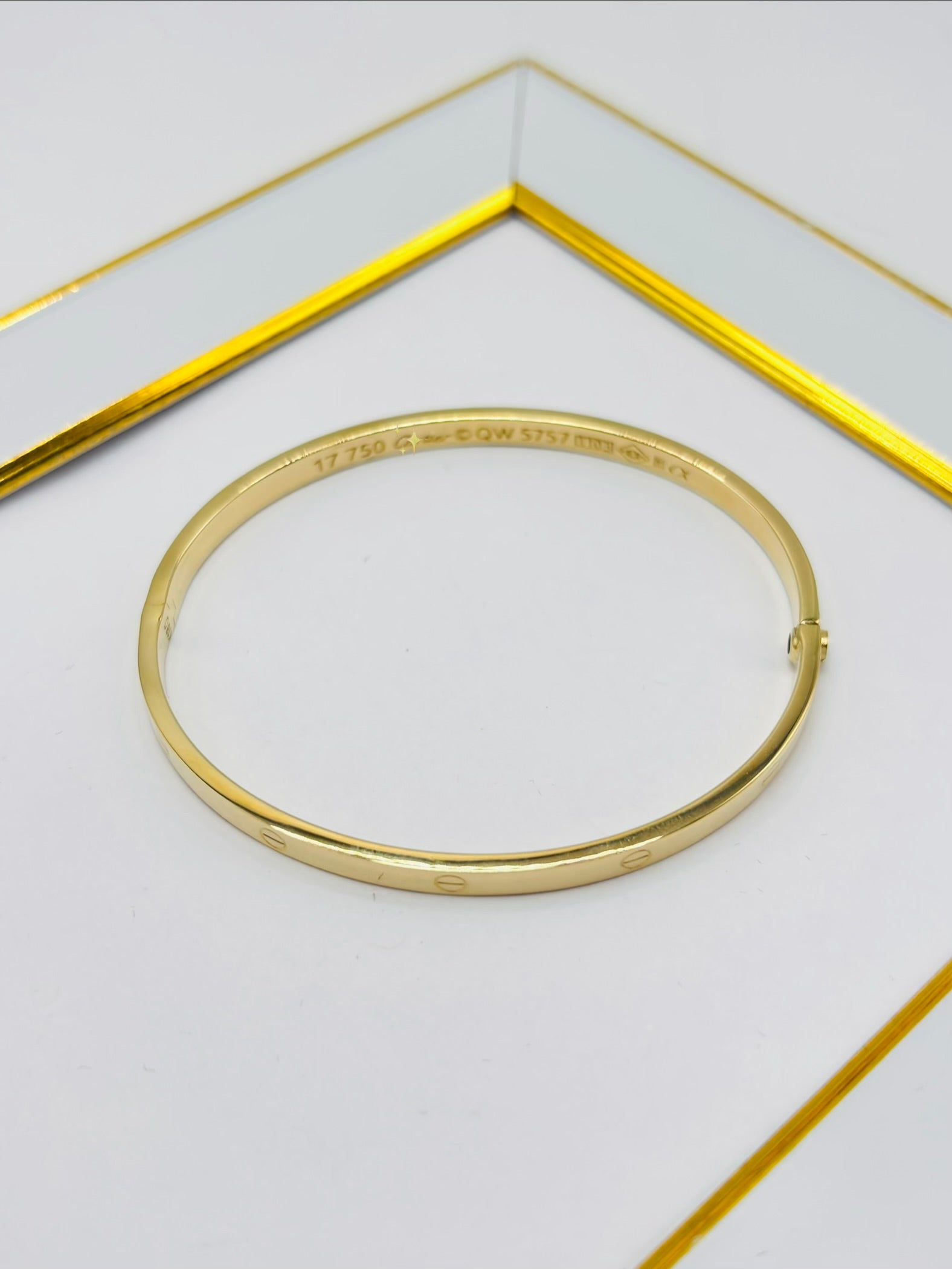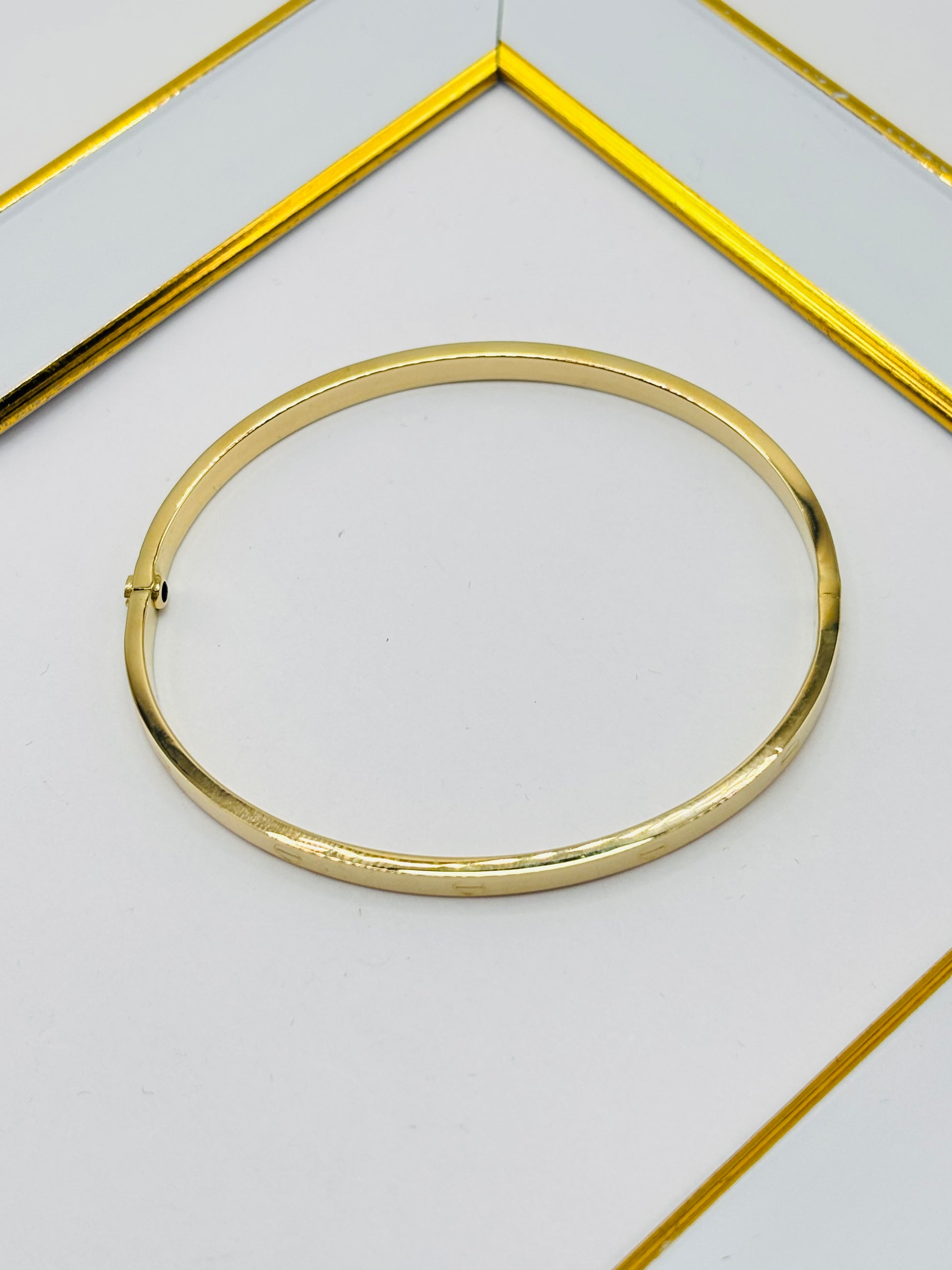18K Gold Love Slim Bangle Screw Type Elevate your elegance with this refined 18K gold bangle, designed for those who appreciate understated luxury. The slim profile sits gracefully on the wrist, while the secure screw-lock mechanism ensures your precious piece stays exactly where it belongs. Crafted from pure 18K gold, this timeless bangle transcends fleeting trends—it's an investment in enduring sophistication. Whether worn solo for minimalist impact or layered with complementary pieces, it becomes the signature accessory that speaks to your refined taste. A versatile treasure that transitions seamlessly from boardroom to evening, this bangle deserves a place in every luxury jewelry collection.