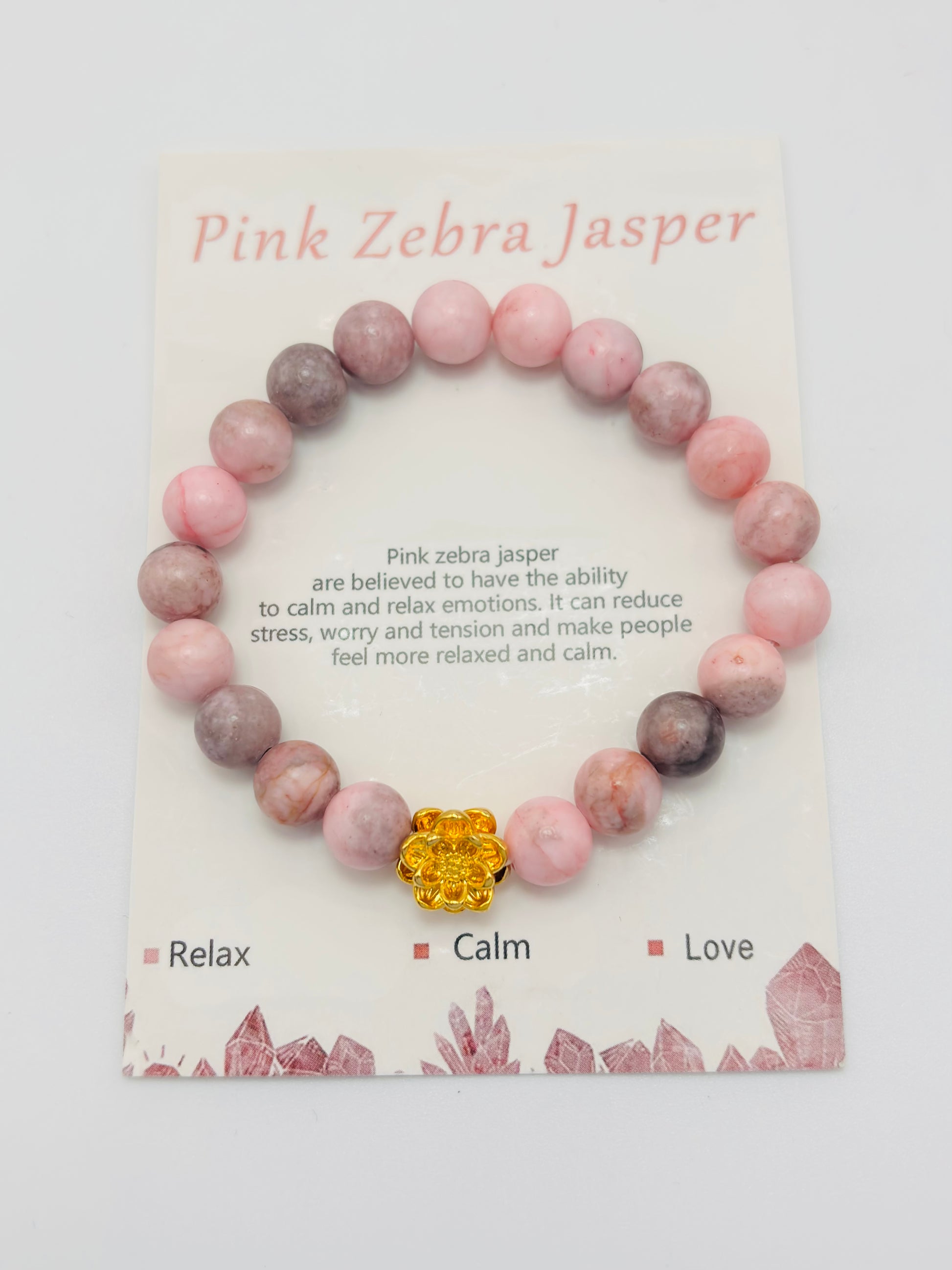 18K Gold Lucky Lotus Flower Bracelet Pink Zebra Jasper Stone ( Hollow Empty Inside)