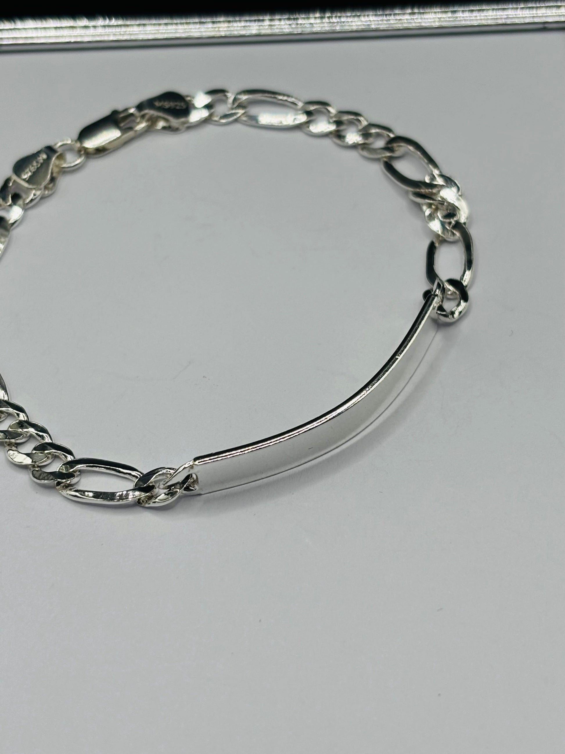 Crafted from genuine S925 sterling silver, this Figaro bracelet combines timeless elegance with refined craftsmanship. The distinctive Figaro chain—featuring alternating short and long links—creates visual interest while maintaining a sophisticated aesthetic. Personalized with a custom name plate, this piece becomes a meaningful accessory that celebrates individuality. Perfect for layering or wearing solo, it transitions seamlessly from everyday wear to special occasions. The secure clasp ensures durability, while sterling silver's natural luster develops a beautiful patina over time, adding character to your collection.
